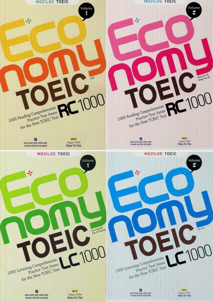 Bộ sách “Economy TOEIC” gồm 5 tập, mỗi tập có 10 đề thi Nghe – Đọc sát với cấu trúc đề thật từ IIG. Nội dung gồm đề mẫu, script, đáp án và hướng dẫn chấm điểm rõ ràng. Sách phù hợp để luyện đề thực chiến và cải thiện tốc độ làm bài. Tuy nhiên sách không có phần giải thích chi tiết cho từng câu khó, nên người học cần có khả năng tự phân tích hoặc có giáo viên hướng dẫn.